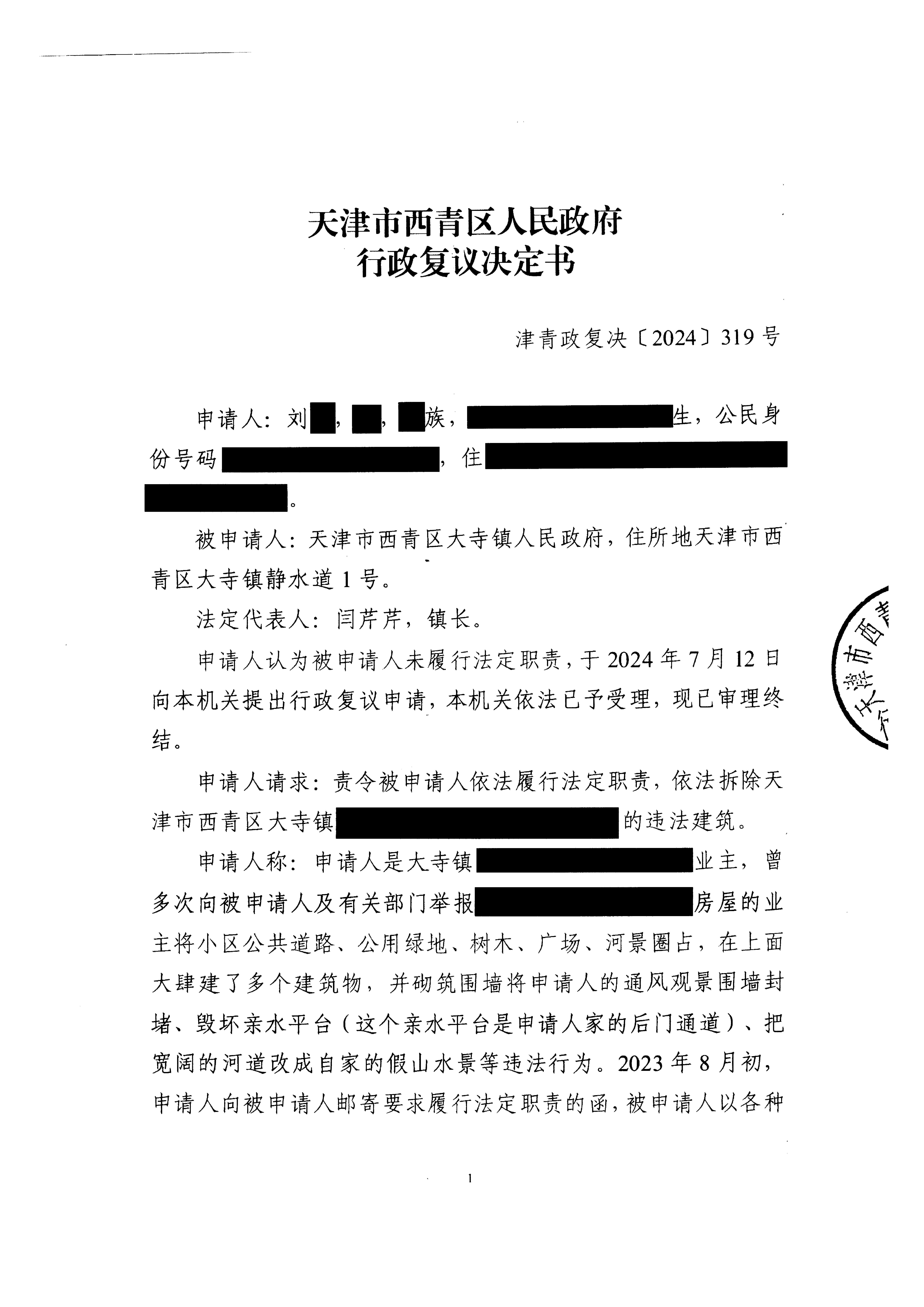 刘某不服在线赌场 大寺镇人民政府未履行法定职责行政复议案