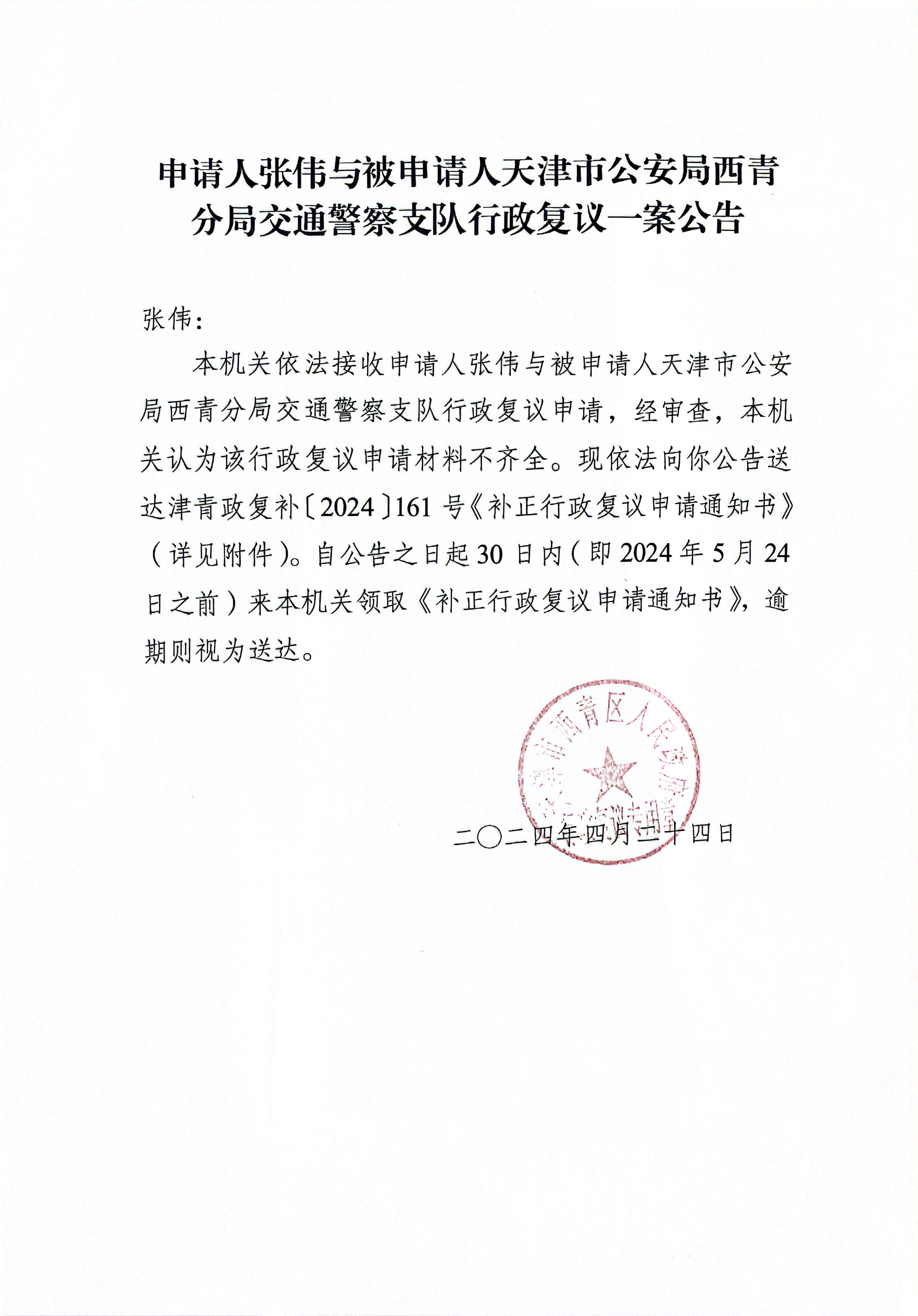 申请人张伟与被申请人天津市公安局西青分局交通警察支队行政复议一案公告
