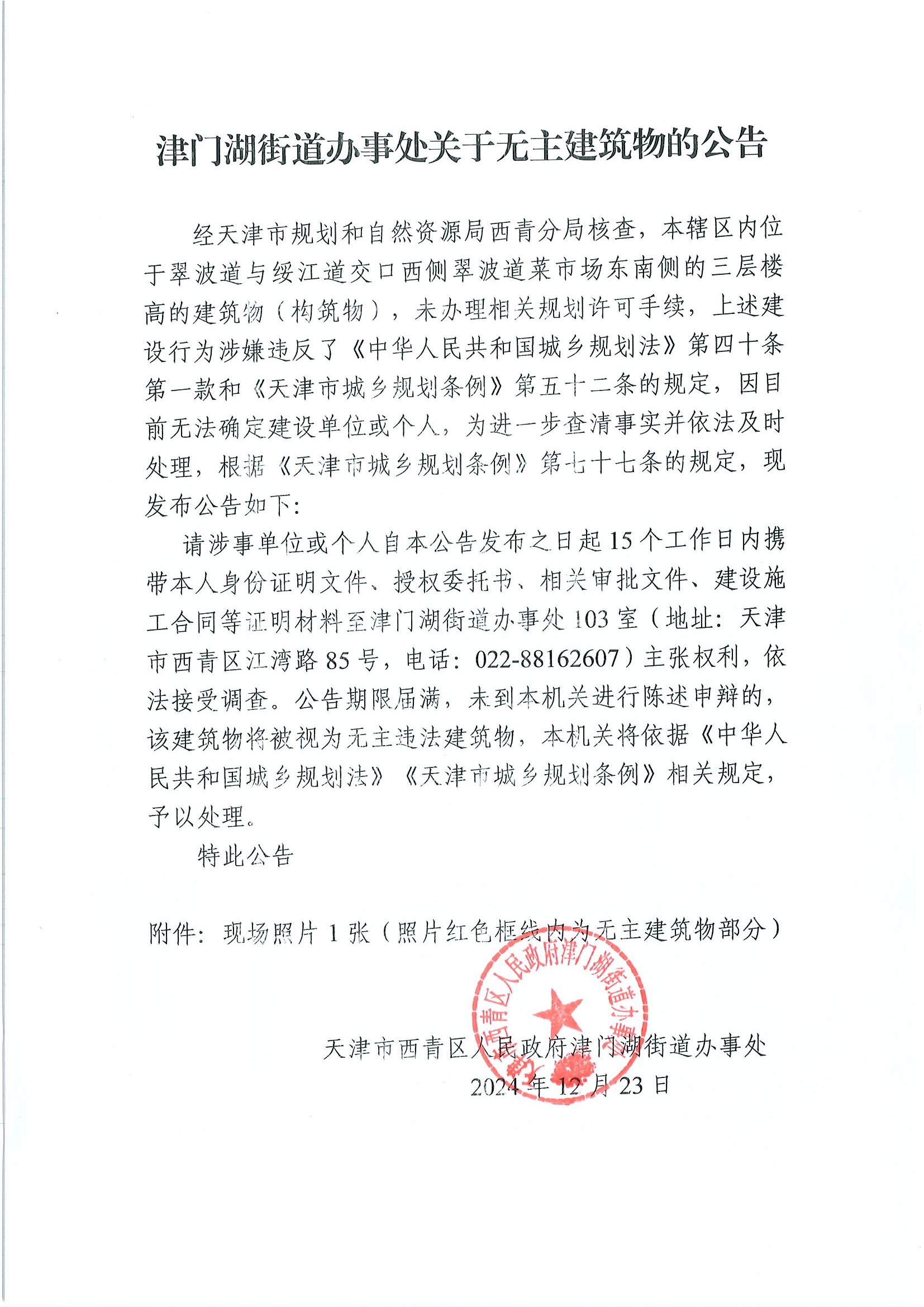 请涉事单位或个人自本公告发布之日起15个工作日内携带本人身份证明文件、授权委托书、相关审批文件、建设施工合同等证明材料至津门湖街道办事处103室(地址:在线赌场 江湾路85号,电话:022-88162607)主张权利,依法接受调查。公告期限届满,未到本机关进行陈述申辩的,该建筑物将被视为无主违法建筑物,本机关将依据《中华人民共和国城乡规划法》《天津市城乡规划条例》相关规定,予以处理。