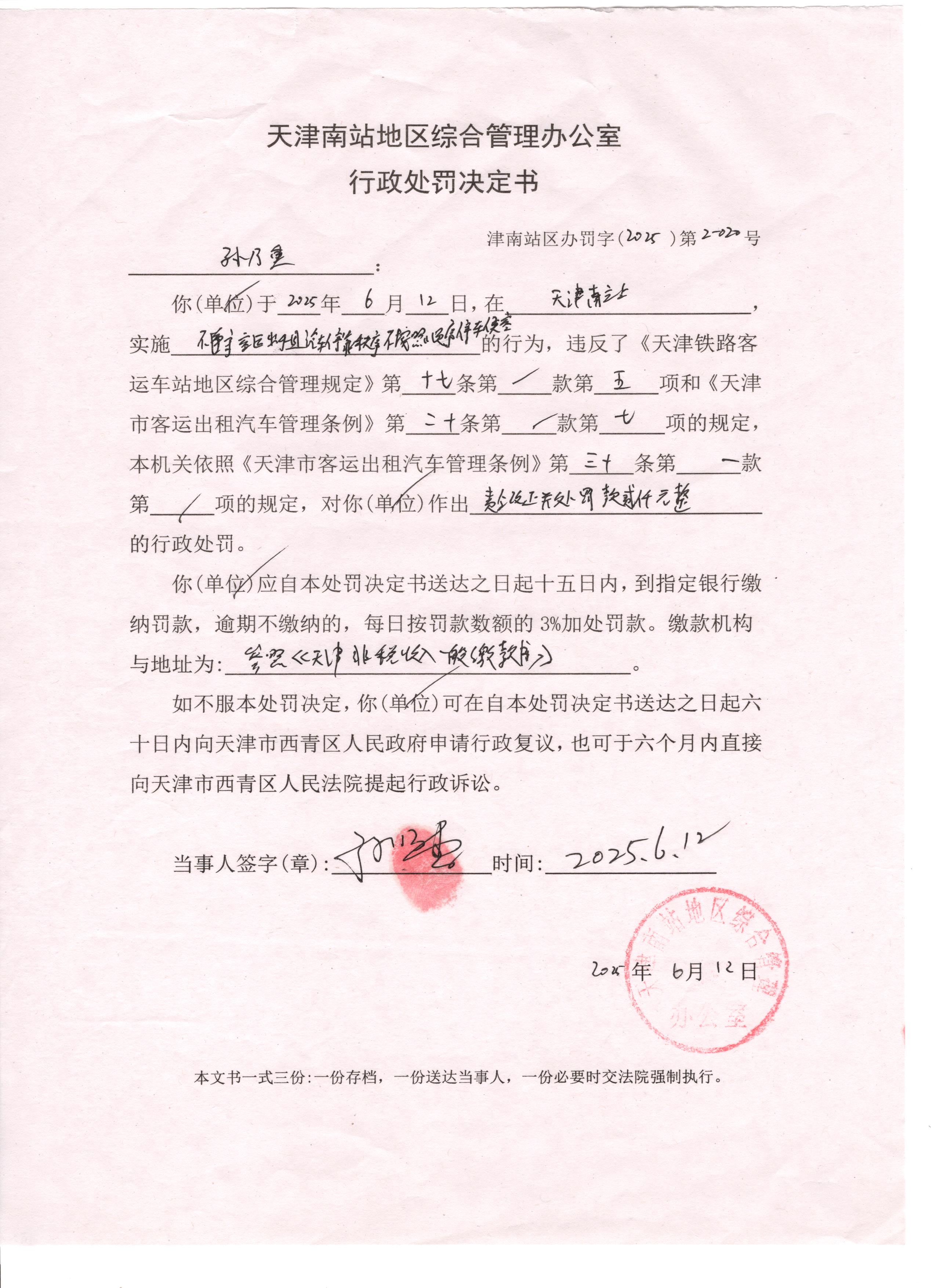 天津南站地区综合管理办公室行政执法决定公示