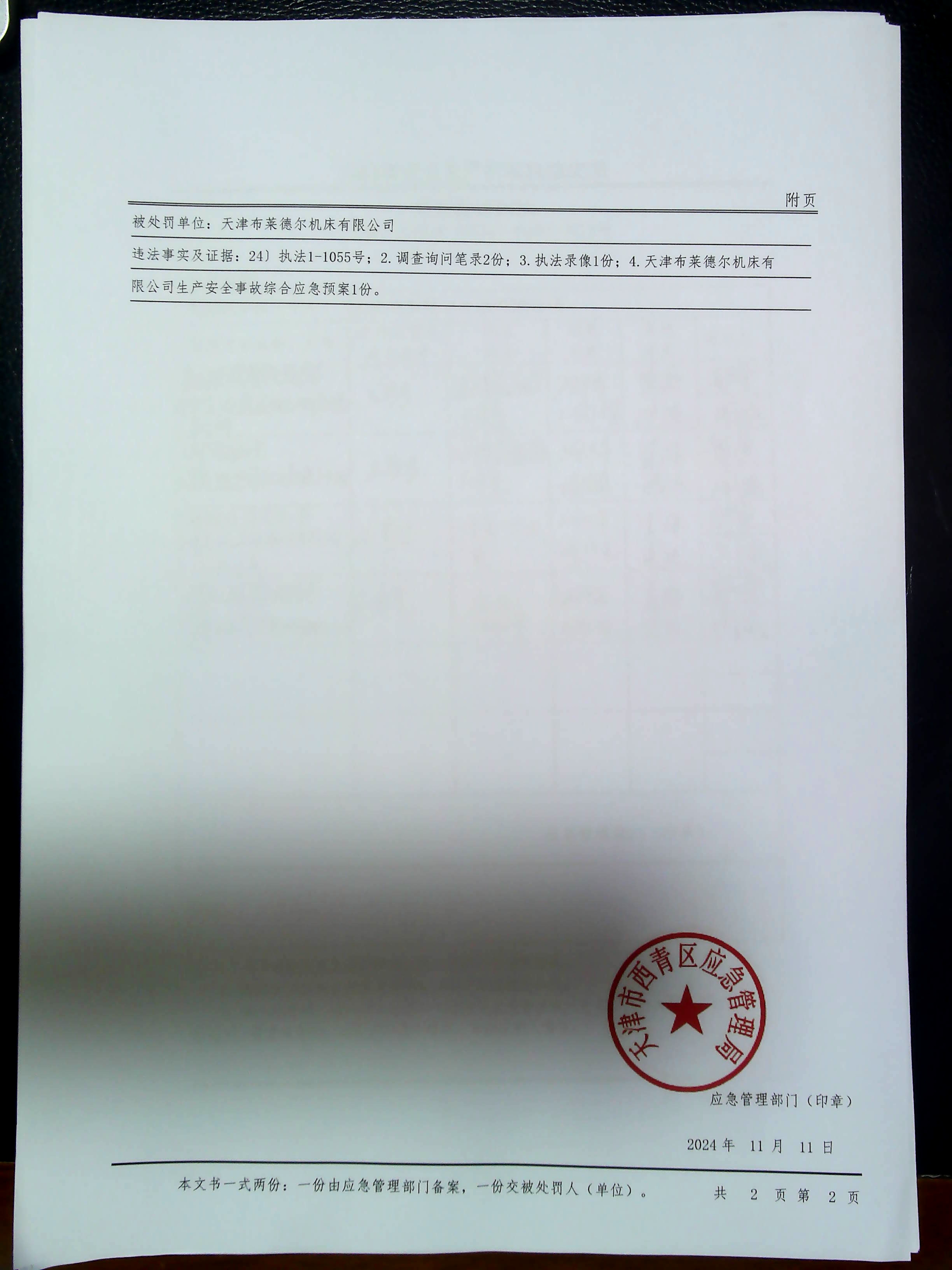 1 天津布莱德尔机床有限公司 天津布莱德尔机床有限公司未定期组织生产安全事故应急预案演练案 在线赌场 应急管理局 2024.11.11 (津青)应急罚﹝2024﹞执法1-1012号