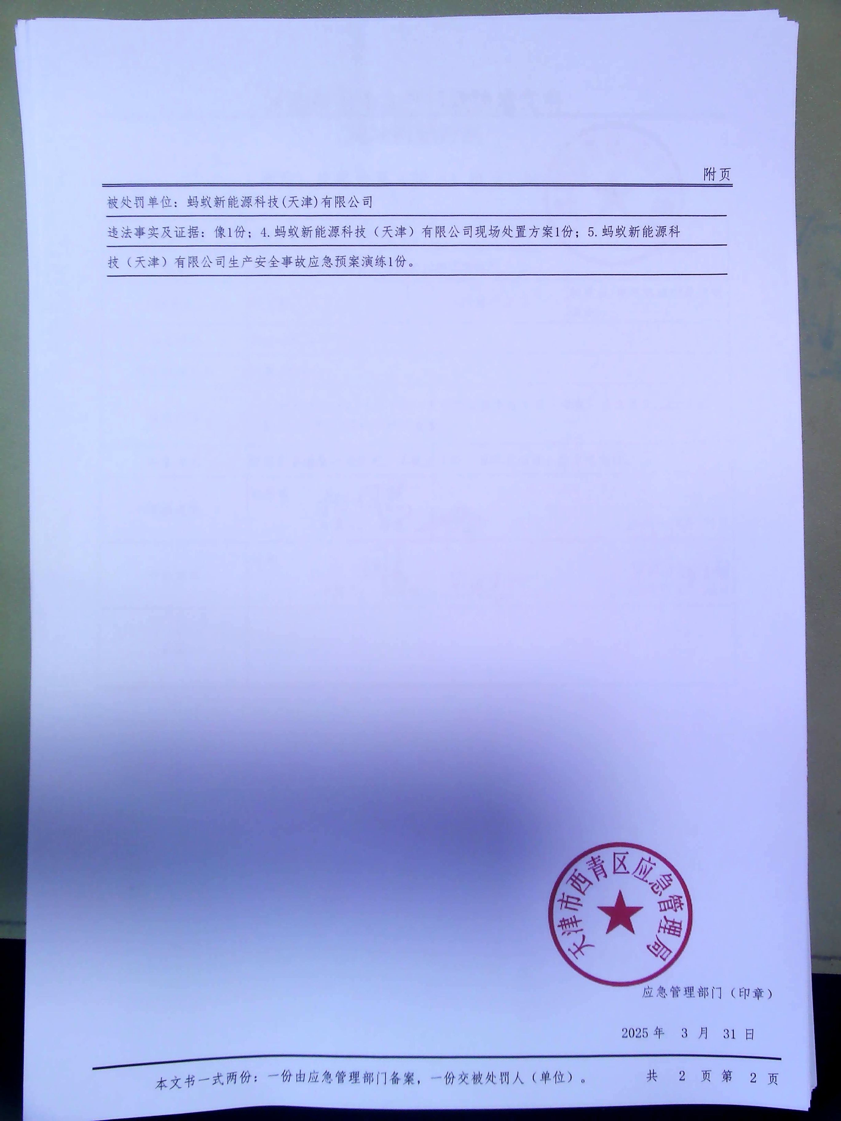 1 蚂蚁新能源科技(天津)有限公司 蚂蚁新能源科技(天津)有限公司未按照规定定期组织应急预案演练案 在线赌场 应急管理局 2025.3.31 (津青)应急罚﹝2025﹞执法1-1002号