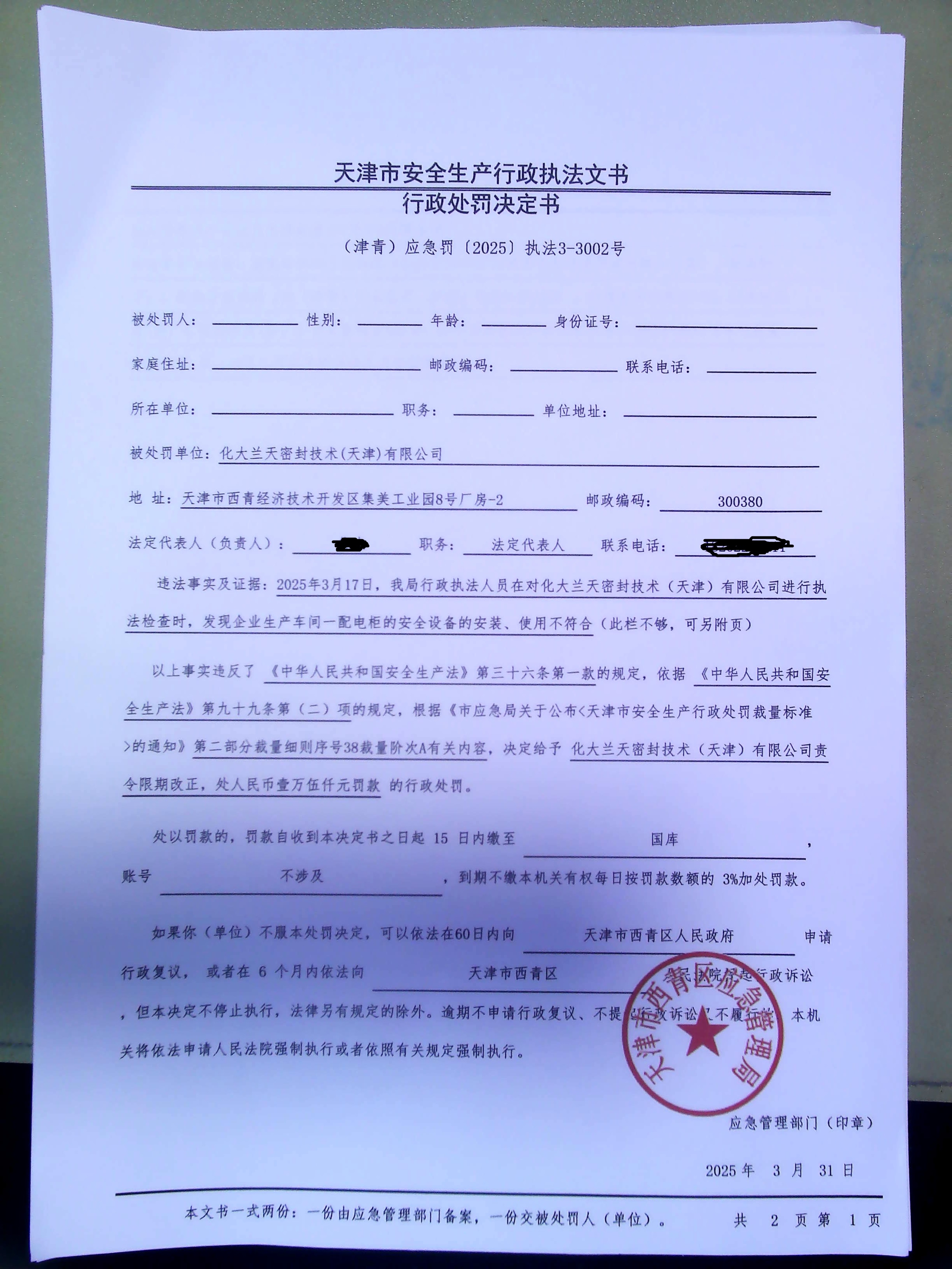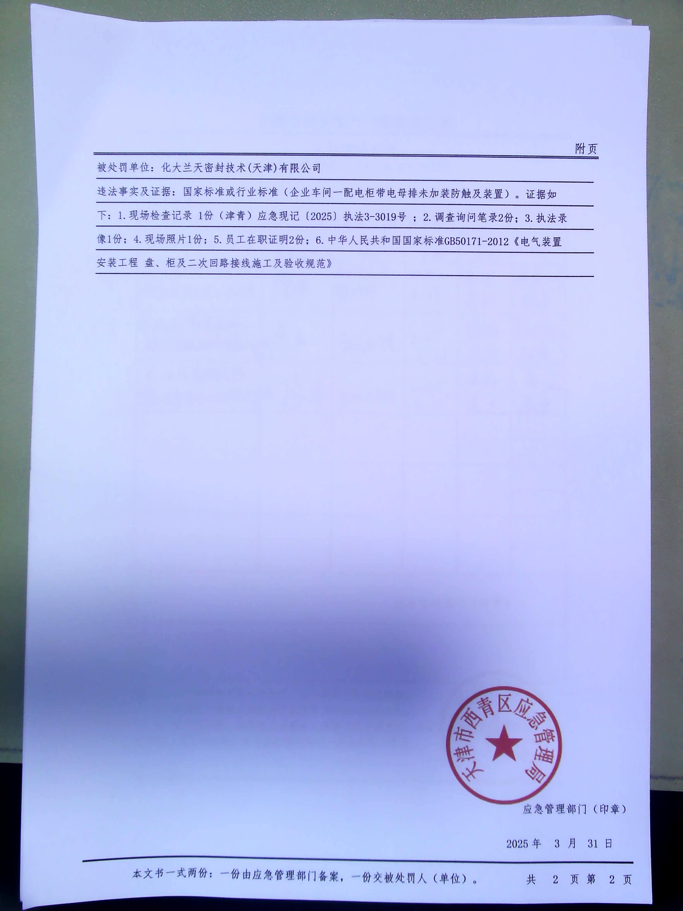 1 化大兰天密封技术(天津)有限公司 化大兰天密封技术(天津)有限公司企业安全设备的安装、使用不符合国家标准或行业标准案 在线赌场 应急管理局 2025.3.31 (津青)应急罚﹝2025﹞执法3-3002号