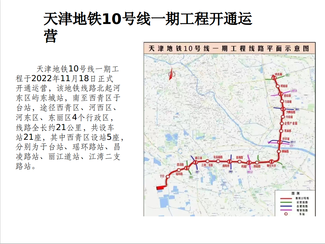 天津地铁10号线一期工程于2022年11月18日正式开通运营,该地铁线路北起河东区屿东城站,南至在线赌场 于台站,途径在线赌场 、河西区、河东区、东丽区4个行政区,线路全长约21公里,共设车站21座,其中在线赌场 设站5座,分别为于台站、瑶环路站、昌凌路站、丽江道站、江湾二支路站。